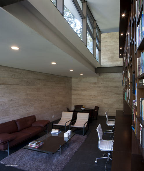 El sistema constructivo de la casa es una estructura metálica que permite los grandes claros y los volados extendidos, así todas las divisiones son muros de block forrados de madera y piedra que en todo momento quedan flotados y no pretenden funcionar como carga.