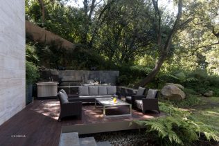 El proyecto básicamente consta de estos cuerpos que flanquean un espacio boscoso rectangular muy arbolado y con una pendiente importante, mayor de 60º. En todo momento la casa se adecua a la topografía y va siendo descendente en el terreno hasta llegar a las áreas ajardinadas, los árboles colindan por toda la casa y hicimos recortes en las estructuras para dejarlos pasar libremente.