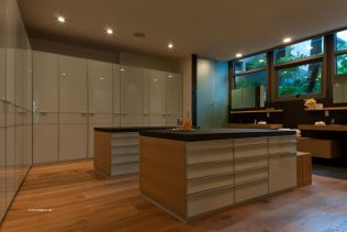 Utilizamos muy pocos materiales para los acabados, colocando en todos los pisos granito negro en dos texturas y los muros importantes de la casa forrados de mármol tavertino en exteriores e interiores y las diviones de habitaciones de madera al igual que el acabados de los pisos en esa zona.