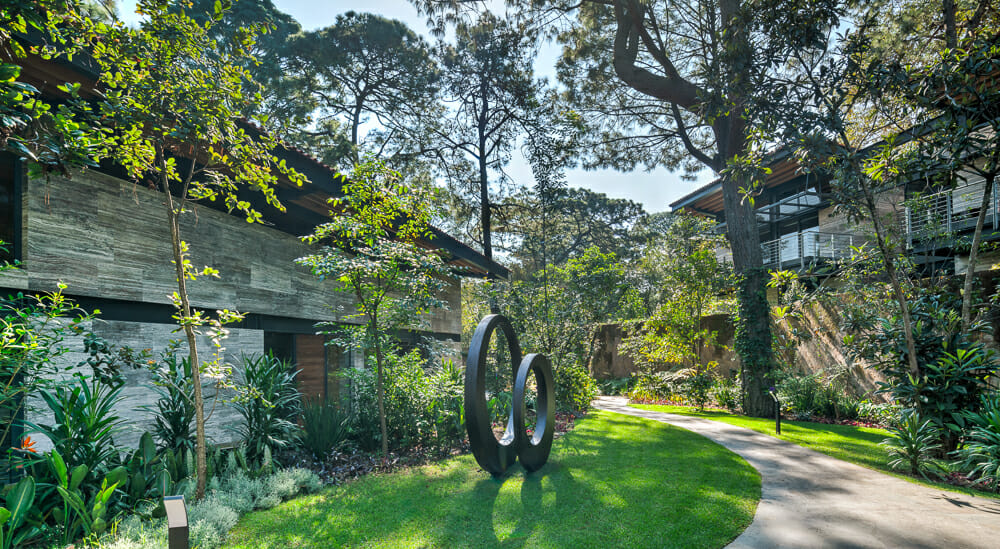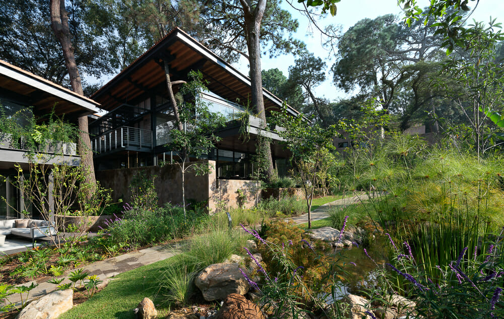 Sobre un terreno completamente arbolado y con topografía descendente realizamos el proyecto de 4 casas independientes de dos niveles con sus amenidades comunes. Desde que fuimos al sitio y vimos esos enormes árboles, decidimos no tocarlos y desplantamos las casas de manera casi quirúrgica adaptándose a los desniveles y a las condiciones naturales del terreno. El resultado final es que pareciera que las casas llevan construidas años y que la vegetación se plantó al mismo tiempo que la construcción.