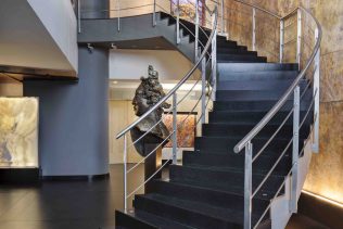 El vestíbulo es un espacio de doble altura con una escalera curva muy protagonista, en esa área tenemos arte en los muros y esculturas de Bronce de Marín.