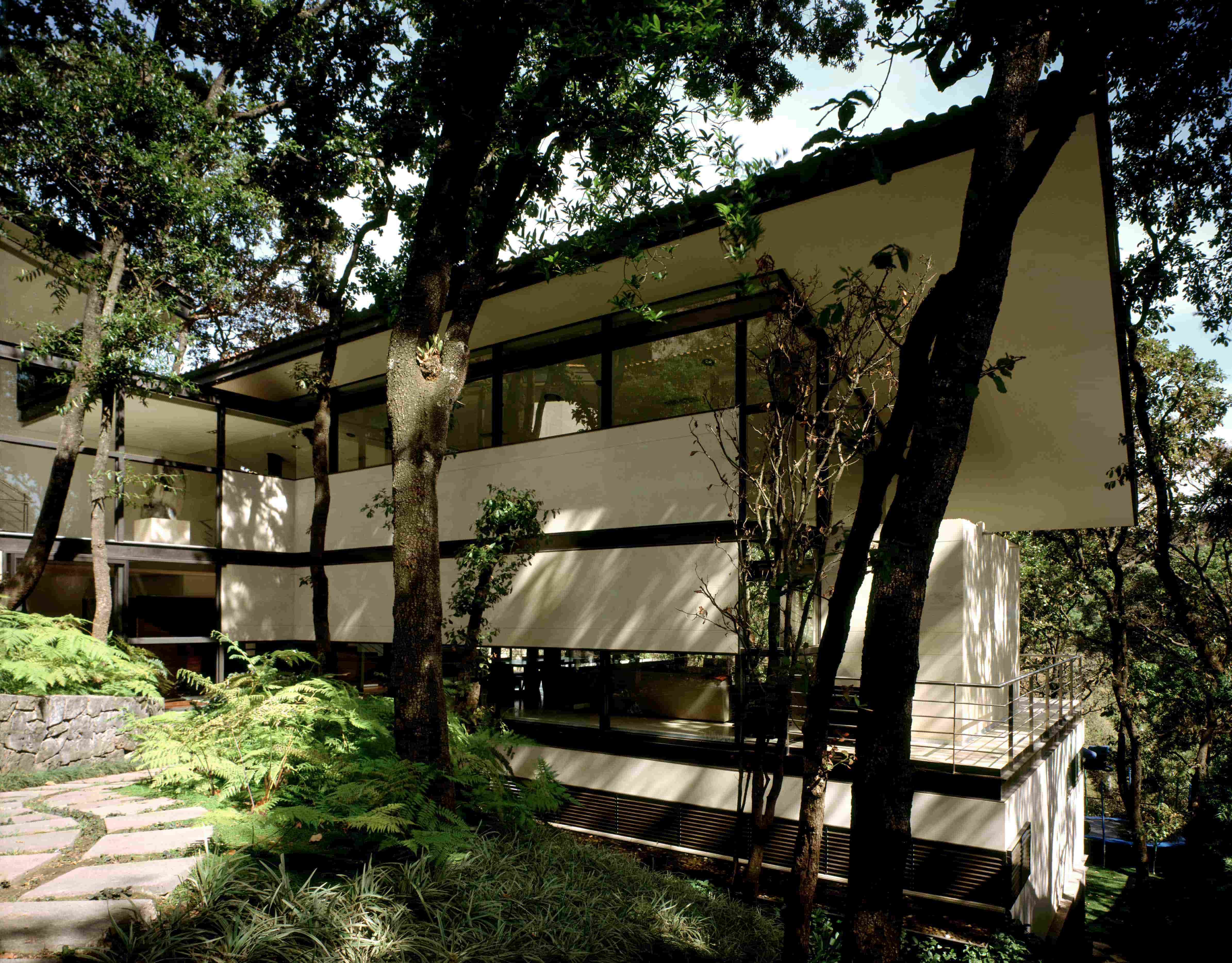 Partiendo de un escaneo tridimensional del espacio, el volumen arquitectónico logra apropiarse de ese vacío que le parecía reservado. Descompuesto en tres cuerpos emergentes, el volumen, logrará apoderarse de ese territorio restante, cobrando presencia entre una concentrada colonia de encinos. El perfil topográfico del sitio es replicado mediante la presencia suspendida de las cubiertas inclinadas de los dos volúmenes principales al clavarse uno de ellos en las curvas superiores y dejarse flotar el segundo sobre aquellas más bajas. Los servicios quedan concentrados en el prisma escasamente enterrado mientras las recámaras y sala comedor se ubican en el prisma parcialmente suspendido. Respondiendo de forma análoga al programa que contienen; la estructura del primero será una banda de concreto perimetral conformando un volumen que se vierte en si mismo, con una predominancia del muro frente al vano; en contraposición, el volumen segundo está estructurado por una serie de columnas remetidas que generan un diálogo entre interior y exterior que parece inadvertir sus fronteras. Una articulación casi virtual funge como conector de ambos cuerpos al tiempo que alberga ese gran vestíbulo que se expone frente al imponente núcleo vegetal. Las fachadas caliza/vidrio se someten a la iluminación, orientación y vistas para ser modeladas. Su opacidad provocará que los espacios se dilaten y contraigan en un juego del que participa el entorno; sugerido mediante ranuras, bloqueado por paños opacos e incluso incorporado a través de una inadvertida transparencia.